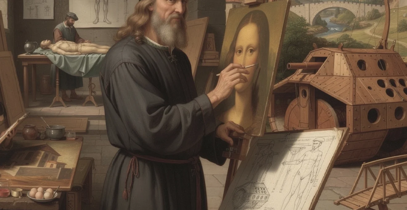 Léonard de Vinci incarne à lui seul l’idéal de l’homme de la Renaissance, fusionnant avec un génie inégalé l’art, la science et l’ingénierie. Né en 1452 dans le petit village toscan de Vinci, cet esprit universel révolutionna non seulement la peinture occidentale avec des chefs-d’œuvre comme La Joconde et La Cène, mais transforma également notre compréhension de l’anatomie humaine, de l’ingénierie militaire et de l’observation scientifique. Ses innovations picturales, notamment le développement du sfumato et ses expérimentations techniques audacieuses, continuent d’influencer les artistes contemporains. Ses milliers de dessins et notes, rédigés en écriture spéculaire, témoignent d’une curiosité insatiable qui le poussa à explorer tous les domaines de la connaissance humaine.